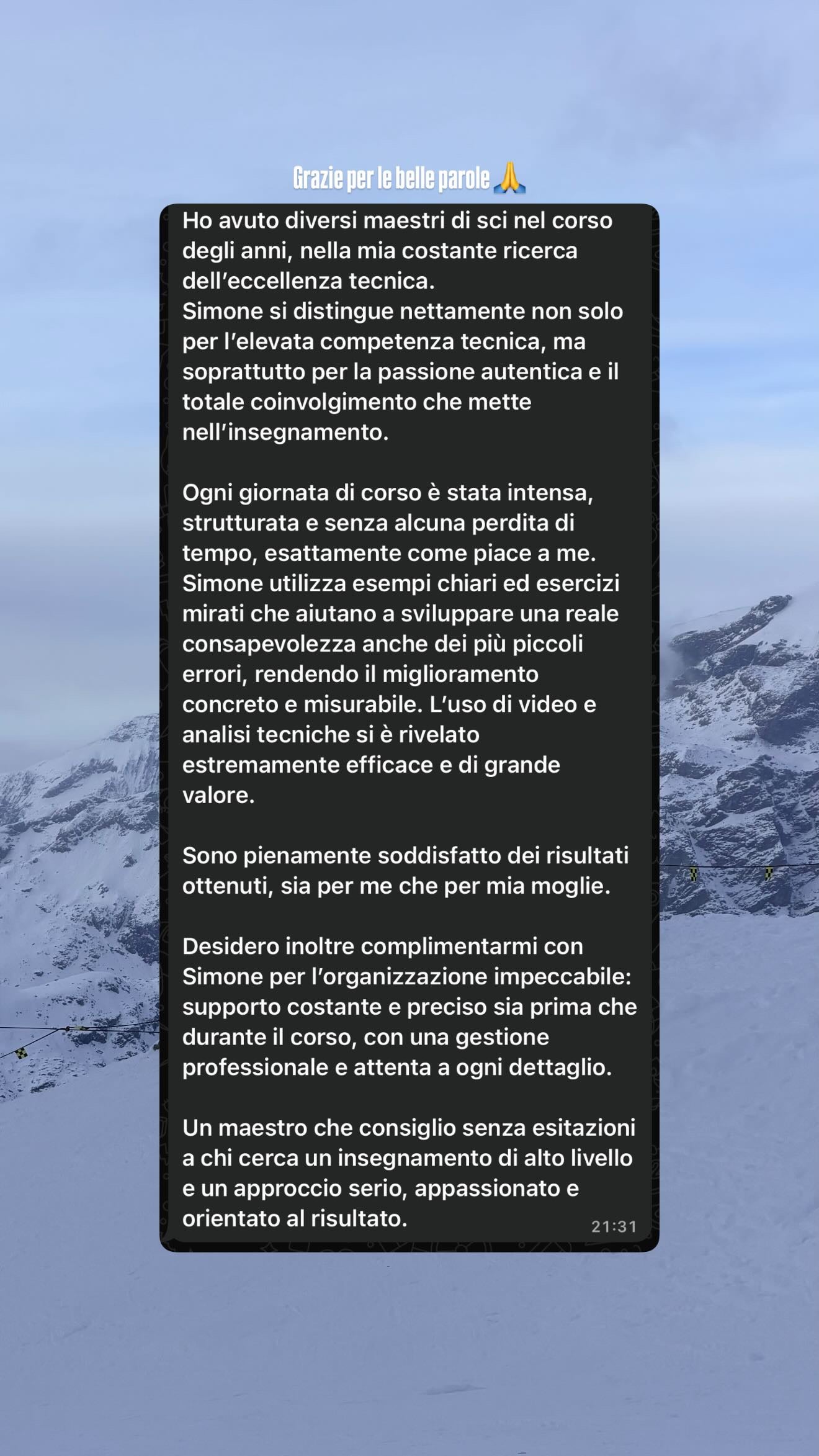 Negli anni ho insegnato sci in Italia e all’estero, aiutando centinaia di persone, dai principianti agli atleti, a migliorare la loro sciata in modo concreto e consapevole.